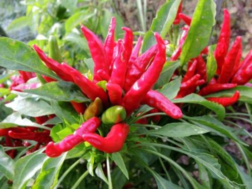近所の畑でトウガラシが実っているのを見た。おそらく自分の家だけて食べるものを作っている畑だろう。いろいろな種類の野菜を少しずつ植えてある。トウガラシはその端っこに植えられていた。最初は上の写真の鮮やかな方が目に入ったが、隣の株は葉の下に長…
