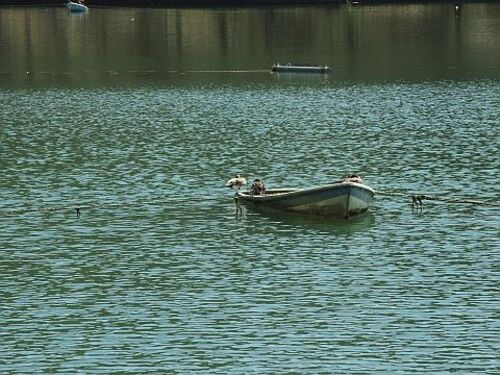 打ち捨てられた感じの手漕ぎボートが千代田湖に浮いていた。ここはヘラブナやブラックバスで釣人たち知られている湖だそうだ。この日も平日にもかかわらず多くの人々が糸を垂れていた。ボートにはロープが繋がってはいるのは見えるのだが、桟橋からは遥かに…