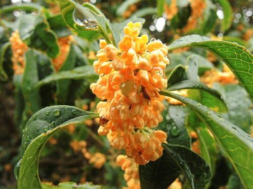 街を歩いていると、街路樹や庭先からキンモクセイの匂いが漂ってくる。今まさに花盛りだ。雨上がりの時にその花をクローズアップで撮ってみた。小さな花の間に雨粒を貯め込んでいるかのように見えた。